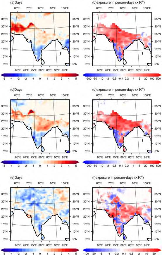 Figure 4. Impacts of Anthropogenic heat release on annual heatwave days and population exposure (units: person‐days) during springtime (MAM) in South Asia at the end of the century: (a) Daytime heatwave days, (c) nighttime heatwave days, (e) compound daytime‐nighttime heatwave days, (b) population exposure to daytime heatwaves, (d) population exposure to nighttime heatwaves, (f) population exposure to compound daytime‐nighttime heatwaves. Shaded areas indicate changes that are statistically significant (p < 0.05) based on t‐test.