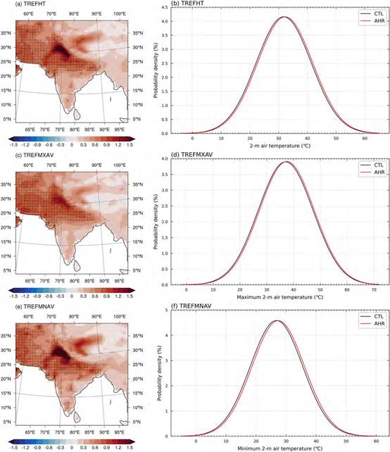 Figure 3. Impacts of Anthropogenic heat release (AHR) on surface temperature in South Asia during spring (MAM) at the end of the 21st century (units: K), showing (a) mean temperature, (b) probability density distribution of mean temperature in statistically significant regions considering AHR (red) versus control experiment (black), (c) maximum temperature, (d) probability density distribution of maximum temperature in statistically significant regions considering AHR (red) and control experiment (black), (e) minimum temperature, and (f) probability density distribution of minimum temperature in statistically significant regions considering AHR (red) versus control experiment (black). Shaded areas indicate changes that are statistically significant (p < 0.05) based on t‐test.