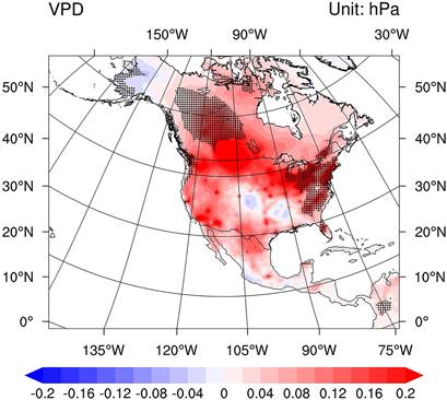 Figure 2. Impact of Anthropogenic heat release on the vapor pressure deficit during summer from 2081 to 2100 (unit: hPa). The shaded areas indicate statistically significant changes at the 0.05 level.