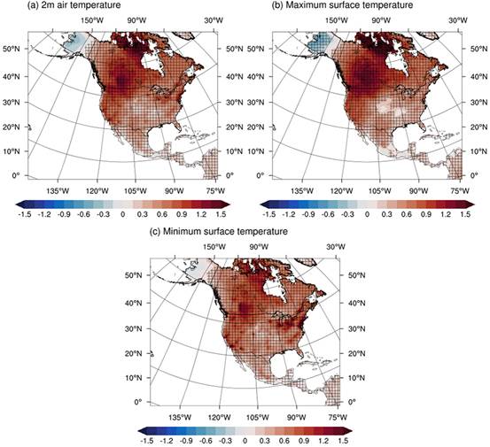 Figure 1. Impacts of Anthropogenic heat release on summer (JJA) surface temperature in North America from 2081 to 2100 (unit: °C): (a) mean temperature; (b) maximum temperature; (c) minimum temperature. The shaded areas indicate statistically significant changes at the 0.05 level.
