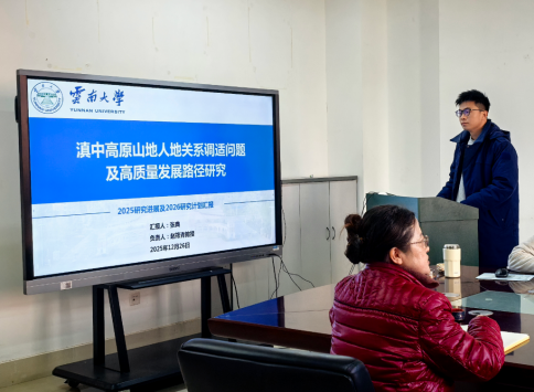 2025年12月26日,云南省科技厅—云南大学“双一流”建设联合专项重大项目“滇中高原山地人地关系调适问题及高质量发展路径研究”2025年度进展工作会在云南大学地球科学学院圆满召开。该项目由云南大学地球科学学院赵筱青教授牵头实施,中国地质调查局昆明自然资源调查中心作为合作单位共同推进。