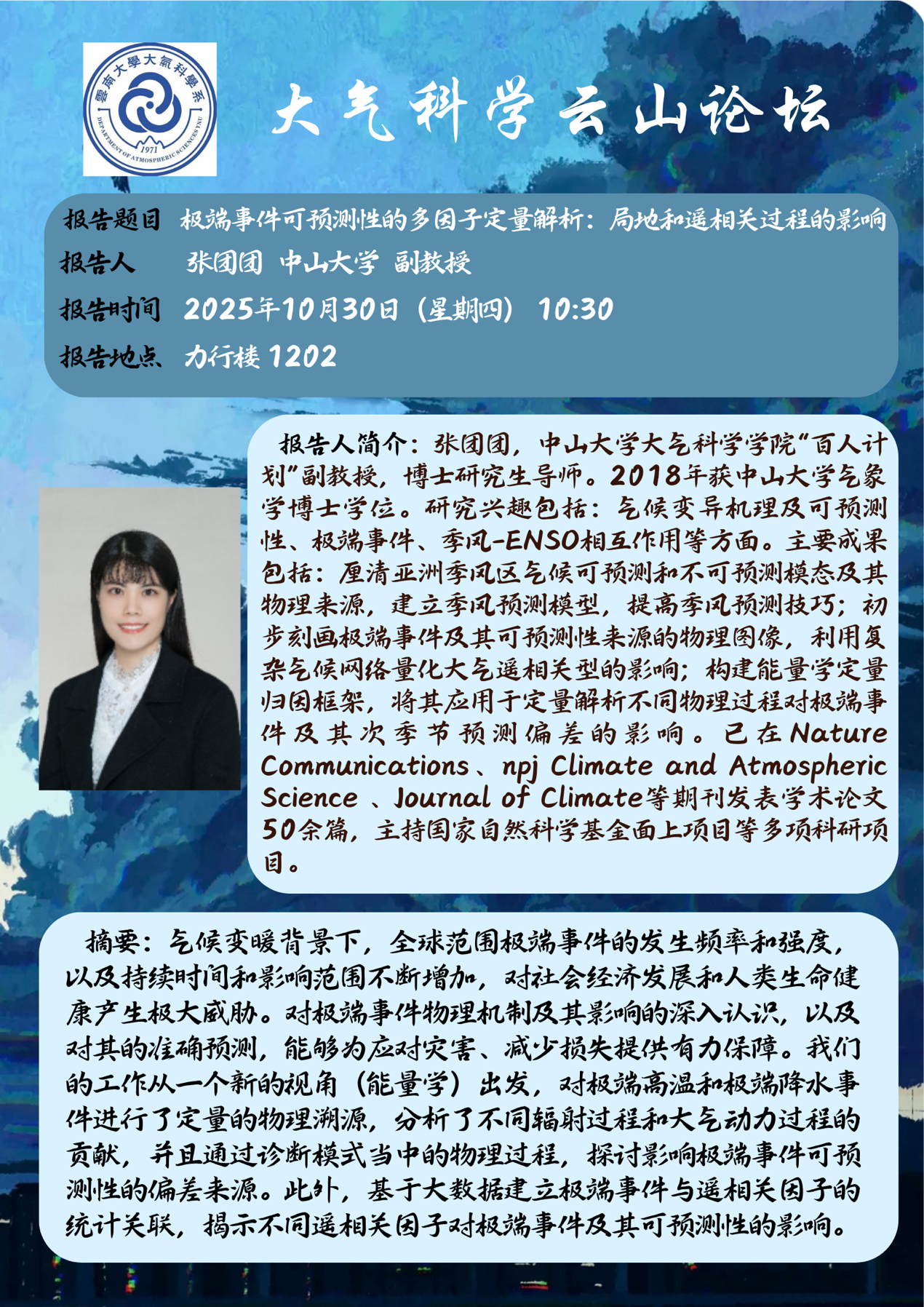 报告题目:极端事件可预测性的多因子定量解析:局地和遥相关过程的影响