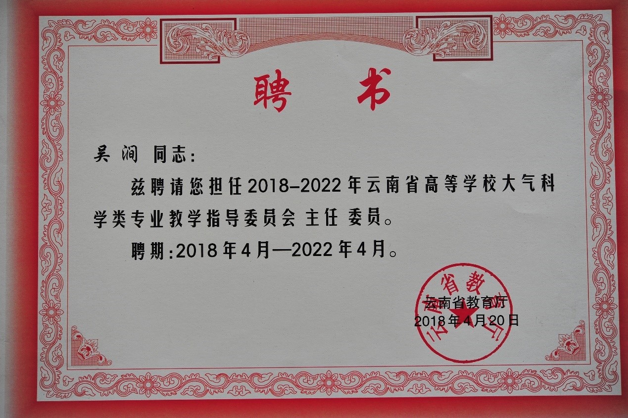 吴涧 聘请担任2018-2022年云南省高等学校大气科学类专业教学指导委员会主任委员